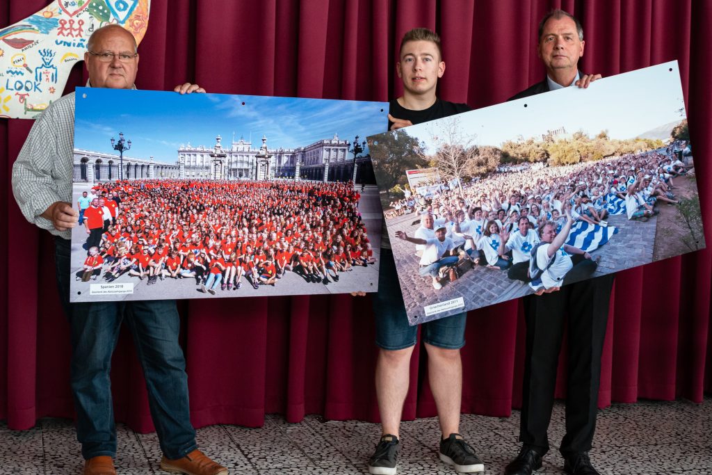 Eine schöne Tradition ist es, dass die Abiturienten “ihrer” Schule ein Geschenk hinterlassen, das an sie erinnern soll. Beim diesjährigen Abitur-Jahrgang, der bei zwei Schulfahrten mit dabei sein durfte, bot es sich an, zwei großformatige Fotos der Schulgemeinschaft in Athen und in Madrid für die Aula zu stiften. Fabian Eske überreichte die beiden Fotos für den Abitur-Jahrgang an Herrn Hanneken und Herrn Wöste: