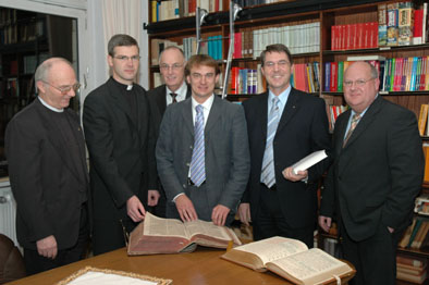Aus dem Jahr 1584 stammt diese Bibel der Handruper Klosterbibliothek, in der der Journalist Andreas Englisch blätterte. Von links Pater Rektor Konrad Flatau, Schulleiter Pater Dr. Heiner Wilmer, Firmenkundendirektor Otto Klüver (Sparkasse Emsland), Andreas Englisch, Sparkassendirektor Ingo Hinrichs und der stellvertretende Schulleiter Paul Wöste.