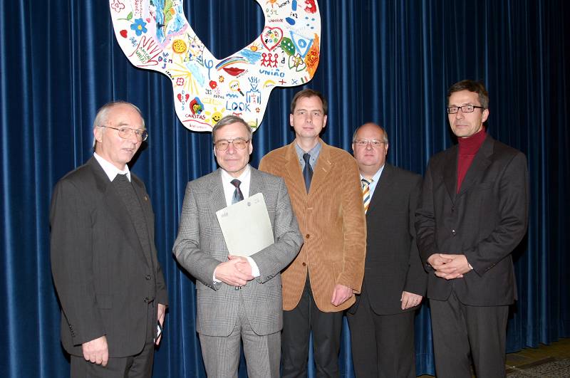 Professor Dr. phil. Jörg Splett (zweiter v. links) referierte im Rahmen des Handruper Forums. Unser Foto zeigt ihn zusammen mit dem Rektor des Herz-Jesu-Klosters, Pater Konrad Flatau (links), dem Organisator der Veranstaltung, StD Karl-Josef Bußmann, dem stellvertretenden Schulleiter, StD Paul Wöste, und StD Franz-Josef Hanneken (v. rechts), der den Kontakt zu Professor Splett herstellte.