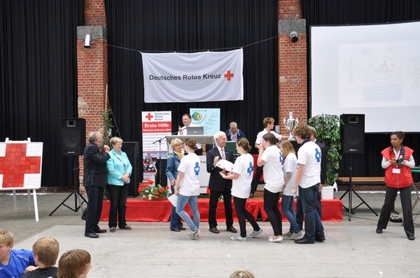 Teilehmer beim SSD-Wettbewerb 2011Erstmalig startete der DRK-Kreisverband Emsland am Dienstag, 21. Juni 2011, einen Leistungswettbewerb für Schulsanitätsdienste (SSD). 15 Aufgaben, bestehend aus den Bereichen Erste Hilfe sowie Spiel und Spaß, bescherten allen Teilnehmern einen schönen Tag. Neben diversen Aufgaben aus den Bereichen Erste Hilfe, Herz-Lungen-Wiederbelebung oder Versorgung eines Bewusstlosen wurde bei zahlreichen Spielen auch der Teamgeist gefordert.Siegerehrung beim SSD-Wettbewerb: 4. und 14. Platz für die beiden Gruppen vom Leoninum Schwierigkeiten hatten viele Jugendliche beim Thema Alkoholpräventation der Polizei Getränke den einzelnen Altersklassen zuzuordnen. 28 Teams mit jeweils fünf Schulsanitätern stellten sich den Aufgaben. Das Gymnasium Leoninum Handrup war mit zwei Gruppen am Start; sie wurden von Alfons Vogelsang betreut und unterstützt. Unsere Schulsanitäter waren mit Ehrgeiz und viel Herzblut dabei. Belohnt wurde dies mit einem 4. und einem 14. Platz.