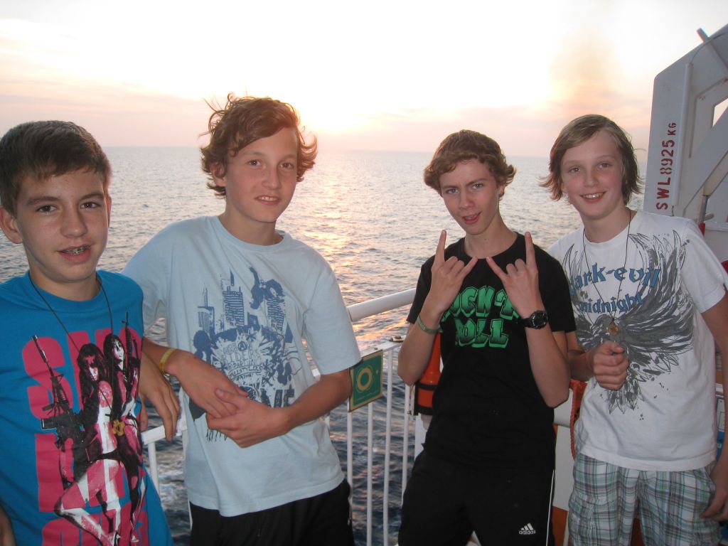 Okay, ein Tag im Bus reicht. Schön, dass wir jetzt das Beförderungsmittel wechseln. Die riesige Fähre bietet mit ihrem Platz und ihren Angeboten viel mehr Möglichkeiten: Viel Auslauf, Ecken zum Spielen, Chillen, Fernsehen … Der Sonnenuntergang auf dem Meer ist ein Traum. Es ist spürbar, dass die Stimmung, die schon vorher nicht schlecht war, steigt. Heute Nacht werden wir gut schlafen: Ob es an der gesunden Meerluft liegt … ?