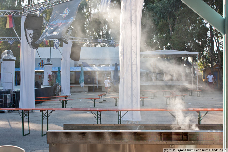 Auf der Rückfahrt vom Sportfest in Nemea passierten wir am 28.9. einen größeren Waldbrand: Ein ganzer Bergzug stand in Flammen. Der Berg ist in sicherer Entfernung zum Lager (ca. 1/2 Autostunde östlich vom Lager, und das Meer liegt auch noch dazwischen). Kurz vorm Erreichen des Lagers konnte man vom Bus aus noch zwei Löschflugzeuge auf dem Weg zum Einsatzort sehen. Eines flog gerade (17.15 Uhr deutscher Zeit) wieder in Richtung Westen in geringer Tiefe über das Lager hinweg. Vielleicht ist das Feuer schon aus?
