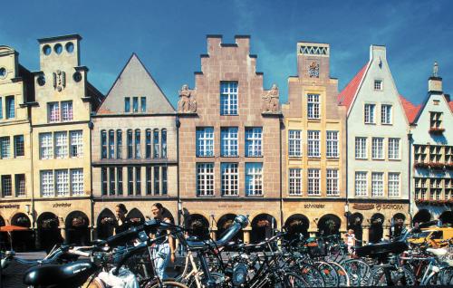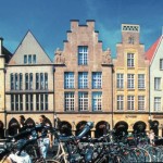 von Frau Springer zunächst bis zum Aasee. Dieses wichtige Naherholungsgebiet der Münsteraner reicht fast bis an die Promenade, einem Grüngürtel, der entlang der ehemaligen Wallanlagen um den mittelalterlichen Kern der Stadt herum verläuft und heute den Fußgängern und Radfahrern vorbehalten ist. Auch dies ist eine Besonderheit Münsters, denn viele andere deutsche Städte haben nach dem Schleifen der Stadtmauern dort eine Ringstraße für den Autoverkehr angelegt. Weiter ging es zur Keimzelle der Stadt: Dem mittelalterlichen Kern um den Dom mit den ältesten Gebäuden der Westfälischen Wilhelmsuniversität und dem Rathaus mit dem Friedensaal. Dieser liegt bereits in der “Guten Stube” Münsters rund um den Prinzipalmarkt. Die Kaufmannshäuser dort mit ihren schmucken Giebeln beherbergen heute Geschäfte des eher gehobenen Bedarfs.