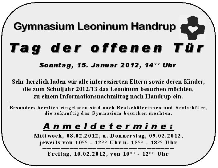 “Tag der offenen Tür 2012” und Anmeldetermine 22. Dezember 2011 | Administrator | Kategorien: Vergangene Aktionen Archiv Vergangene Aktion