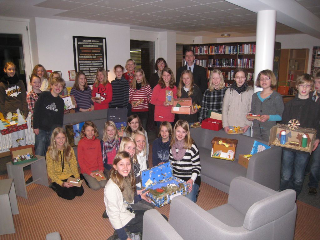 Heute Morgen trafen sich in der Bibliothek alle Teilnehmer, die eine Arbeit bei dem Projekt “Weihnachten im Schuhkarton” eingereicht hatten, mit Frau Wöste und Frau Lemmermöhle. Auch Herr Hanneken war zur Siegerehrung erschienen, doch diese erwies sich als schwierig: Es waren so viele tolle Arbeiten eingereicht worden, dass am Ende schließlich zehn (!!!) Erste Sieger feststanden. Kein Wunder, dass es so viele strahlende Gesichter gab.