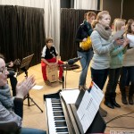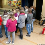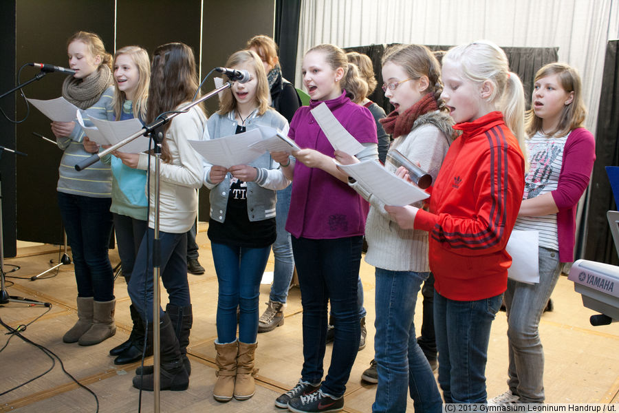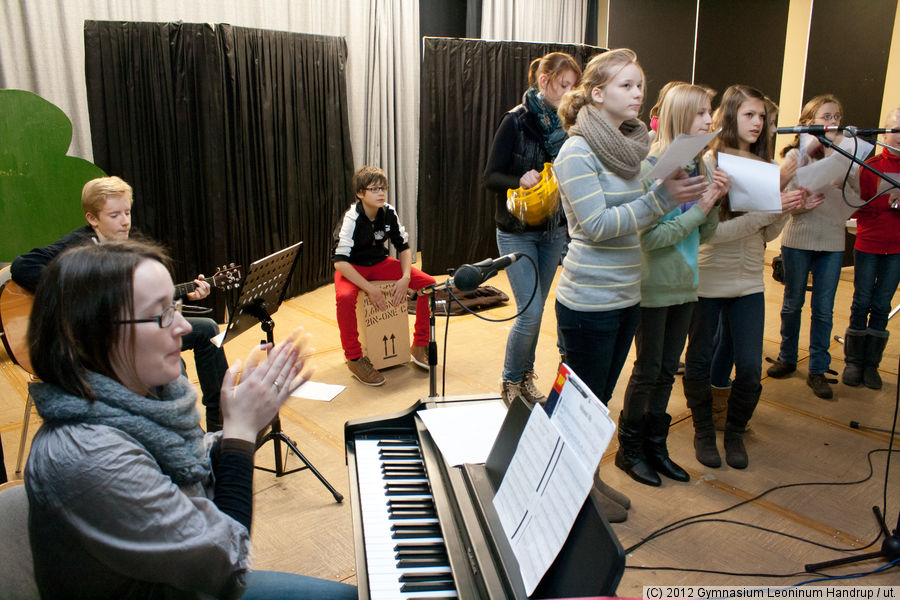 Probe zum Tag der offenen Tür 2012Die Gruppe übt unter Anleitung von Frau Stege für den kommenden Sonntag. Da ist am Leoninum der diesjährige “Tag der offenen Tür”. Und da möchten die Schüler die interessierten Jungen und Mädchen, die im kommenden Schuljahr das Leoninum besuchen wollen, mit einer kurzen Vorführung unterhalten. Was genau das sein wird, soll jetzt nicht verraten werden.