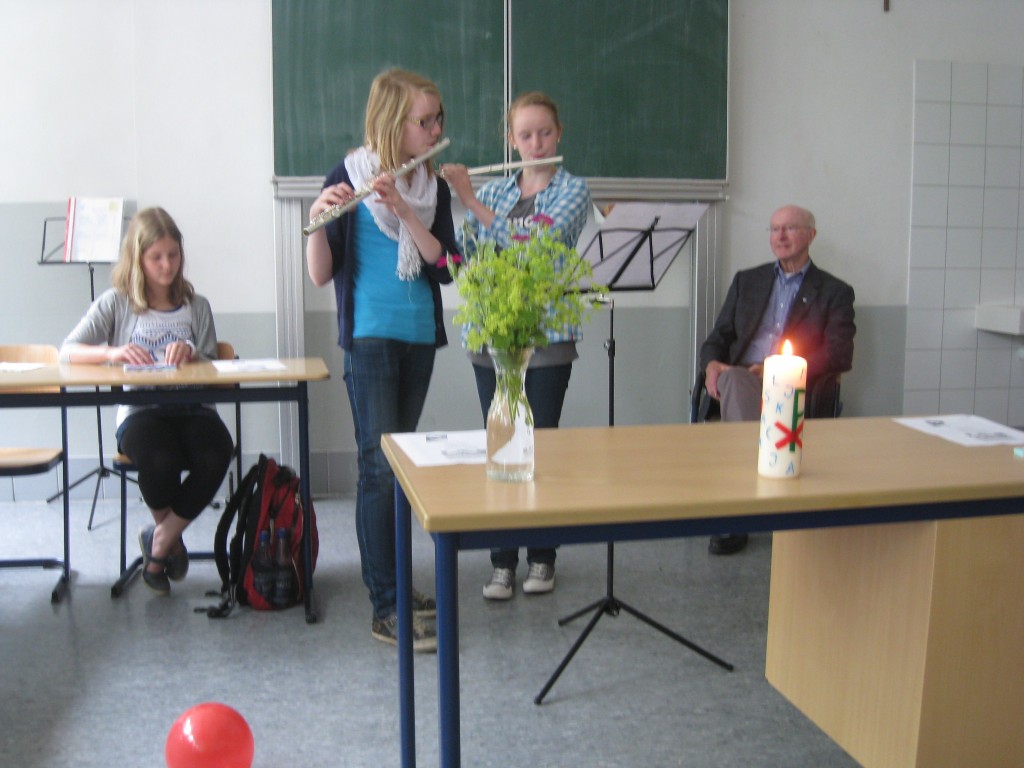 Bei der 100. Griechischstunde der 7. Klassen waren Herr Hanneken und Pfarrer August Raming zu Gast. Die Veranstaltung wurde durch eine Festrede unseres Mitschülers Lars Hackmann eingeleitet. Danach erzählte uns Herr Raming etwas über seinen fünfzigjährigen Weg als Pfarrer und Herr Hanneken schilderte uns den Weg der Ehe. Die Vorträge bezogen sich auf das Thema „Herakles am Scheideweg“ , bei dem es um die Entscheidung für den richtigen Lebensweg geht. Die Gäste strahlten Zufriedenheit mit ihrer Entscheidung aus und zeigten uns, dass man, anders als in den Medien oft berichtet wird, mit Freude und Beständigkeit seinen Lebensweg gehen kann. Zur Versüßung gab es Plätzchen, Kuchen und warmen Kakao. Wie es zu einer Feierstunde gegehört, wurde auch musiziert. (Sophie Raming und Anna Többen)