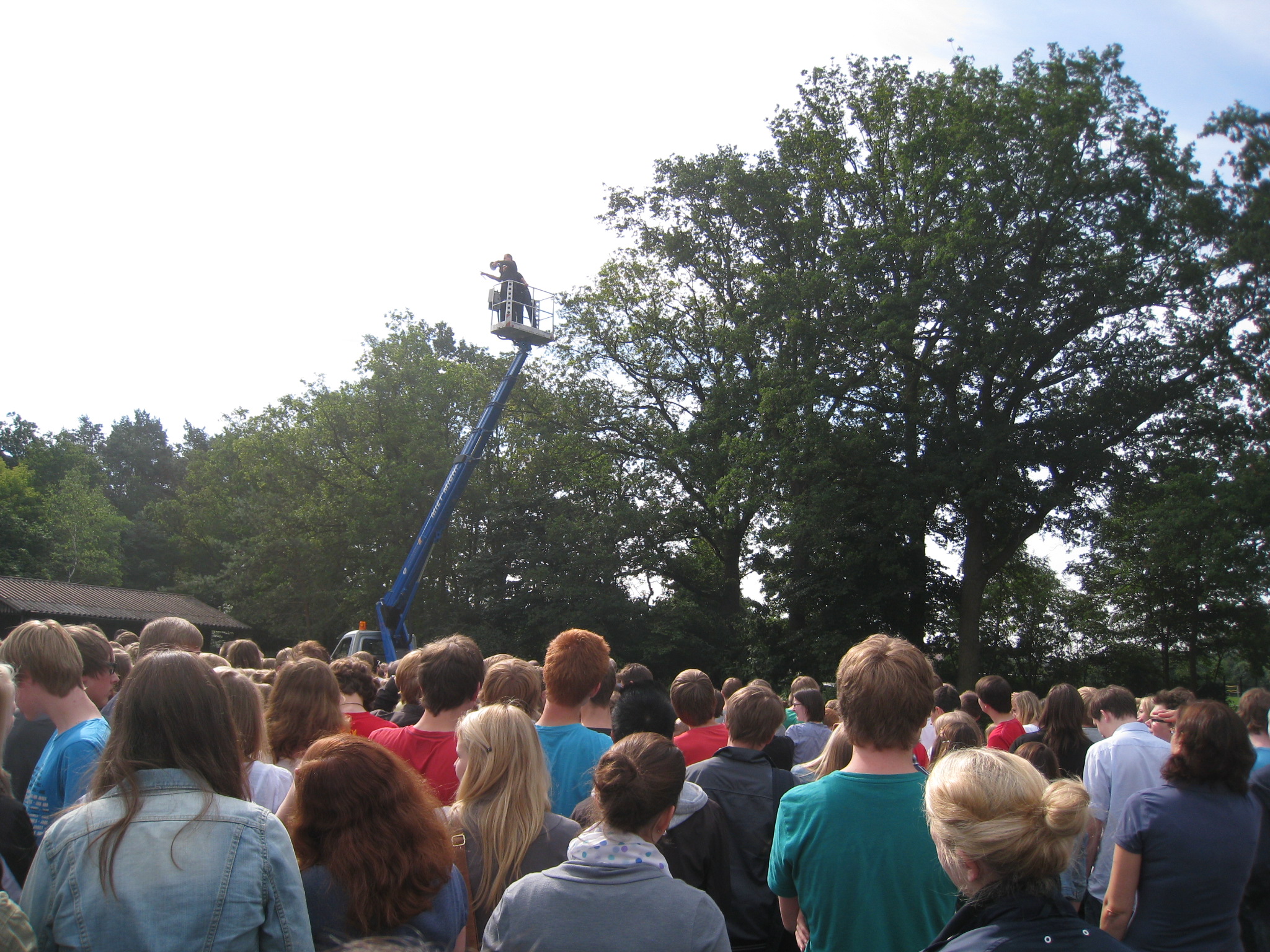 Eine der Aktionen am Dehon-Tag war, dass sich ca. 1200 Schüler und Lehrer auf dem Kleinspielfeld zu einem neuen Foto der Schulgemeinschaft versammelten. Der Mathe-LK von Herrn Rose hatte zuvor den Platzbedarf ausgerechnet und mit Kreide markiert, denn die Aufstellung erfolgte in Form eines Herz-Jesu-Kreuzes. Zügig und diszipliniert versammelten sich alle, sodass die ganze Aktion nur ca. 15 Minuten dauerte. Nun sind alle gespannt, wie das Ergebnis aussehen wird. Von unten sah es jedenfalls so aus: