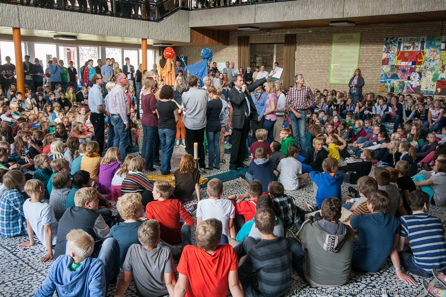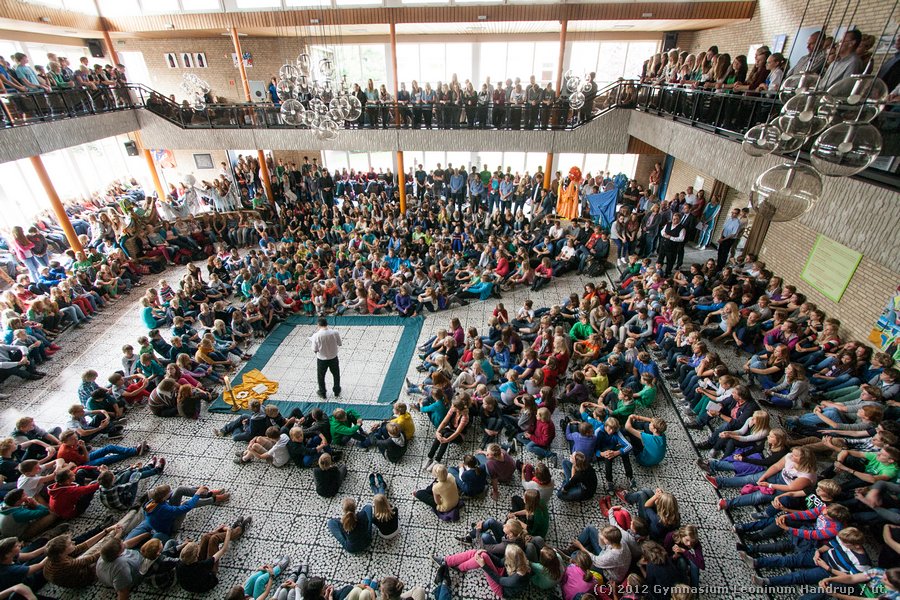 Vollversammlung September 2012Es gab den geistlichen Impuls, Begrüßungen, Vorstellungen und jede Menge Ehrungen und lobende Erwähnungen. Jubilare aus dem Kollegium, die Fußballmädchen vom “Werder-Cup” (vergleiche ein paar Meldungen weiter unten) und Schülerinnen und Schüler mit PET-Certificate (Artikel in ein paar Tagen hier zu finden) wurden in die “Mitte” gebeten oder auch wegen der großen Zahl einfach nur genannt, die Gewinner vom Fußball-Tippspiel im Sommer erhielten kleine Preise, ein paar organisatorische Dinge und Verhaltensregeln gab’s auch noch. Schließlich waren auch noch fünf Geburtstagskinder zu feiern.