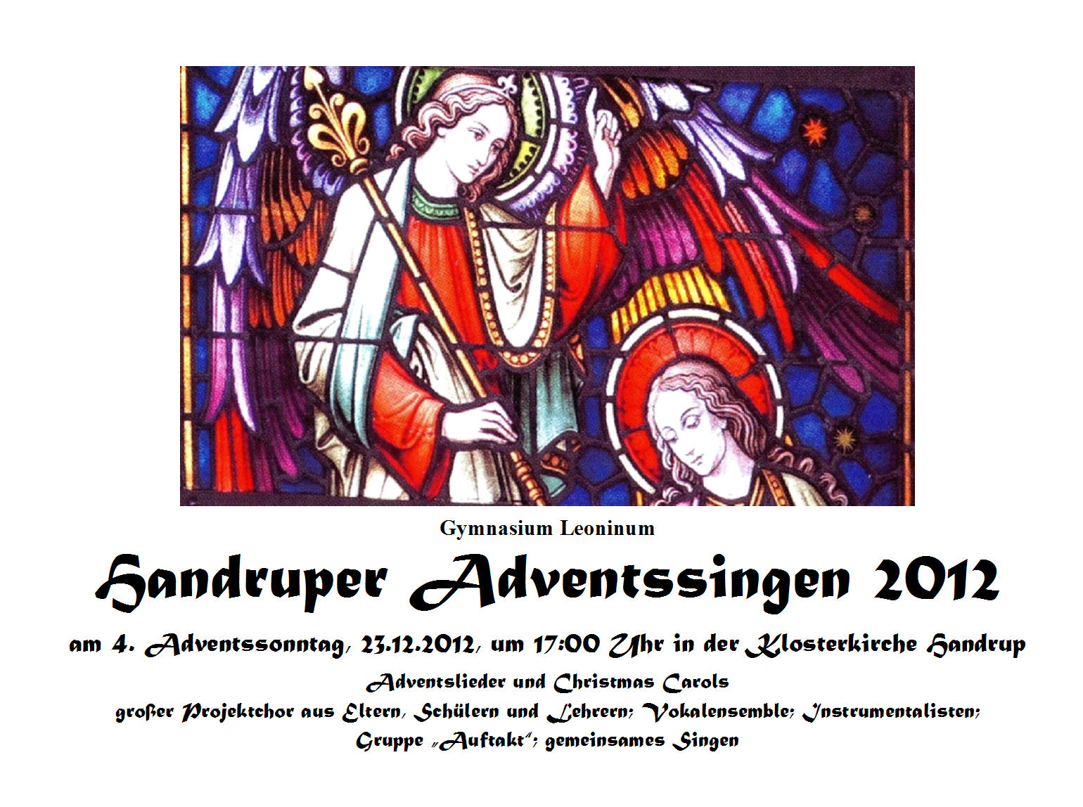 Herzliche Einladung zum offenen Adventssingen am 4. Advent 12. November 2012 | Administrator | Kategorien: Vergangene Aktionen Adventssingen Handrup Leoninum