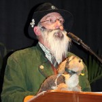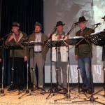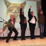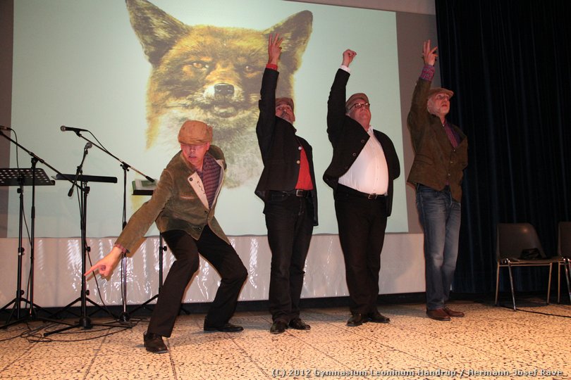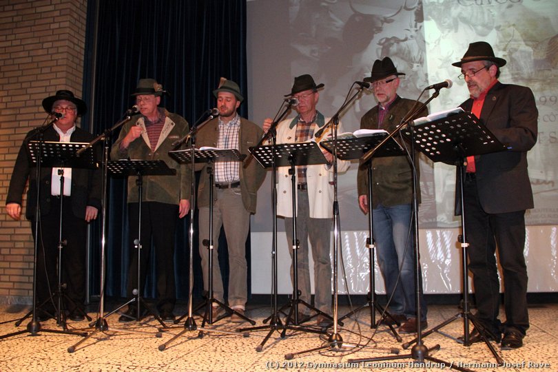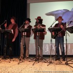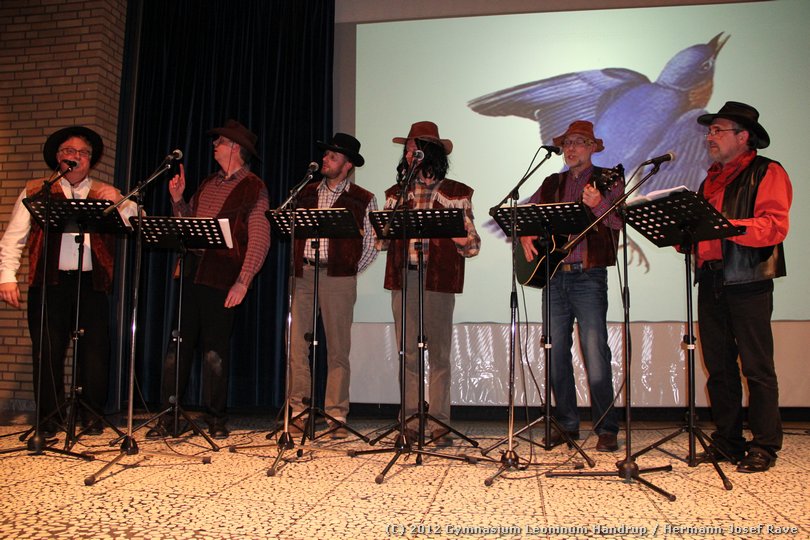 Ganz anders dann der zweite Teil des Abends: Pater Olav Hamelinjck und Antonius Kuiter leiteten diesen mit einem Jagdhornsignal ein und bliesen damit sprichwörtlich zum Dauerangriff auf die Lachmuskeln. Dieter Vinke, als Mischung aus Waidmann und Waldschrat kaum wiederzuerkennen, rezitierte nun nicht mehr Joseph von Eichendorff, sondern brachte mit dem von Franz-Josef Hanneken verfassten Teckelgedicht oder Heinz Erhardts „Gewitter“ das Publikum zum Lachen.Die sechs Sänger hatten inzwischen ihre Fracks gegen Jagdbekleidung getauscht und feierten den Jäger als eine Art romantischen Dichter, der mit dem Gewehr natursinnig und sehnsuchtsvoll durch den Wald streift. Dabei lief das Sextett immer wieder zu musikalischer Höchstform auf, beispielsweise als mit dem Jagdquodlibet drei jagdliche Lieder gleichzeitig gesungen wurden. Dass Johannes Leifeld und Manfred Heuer nicht nur über kräftige Bässe verfügen, sondern auch geschmeidige Knie besitzen, demonstrierten sie beim Red Fox Dance, in dem Franz-Josef Hanneken, der mit großem Wortwitz durch das Programm führte, vollen Körpereinsatz zeigte,dabei mehrfach niedergestreckt wurde und sich doch immer wieder aufrappelte. Spätestens bei diesem Auftritt, der nun wirklich gar nichts mit einem anmutigen Elfenreigen im klaren Mondlicht zu tun hatte, blieb kein Auge mehr trocken.Die Reise ging dennoch weiter, und zwar in die neue Welt, die, bevölkert vom sogenannten „edlen Wilden“, aus romantischer Sicht die älteste und ursprünglichste war. Nicht mehr vom Rhein, sondern vom SwaneeRiver, nicht mehr von der Nachtigall und der blauen Blume, sondern vom bluebird handelten die Lieder, für die sich die Sänger nun in zünftigen Westernoutfits präsentierten. Mit dem letzten Lied, dem „Abschied vom Walde“, schloss sich dann der Kreis. Das hellauf begeisterte Publikum verlangte nach einer Zugabe, bekam diese auch und bedankte sich mit stehenden Ovationen für einen rundum gelungenen Abend.