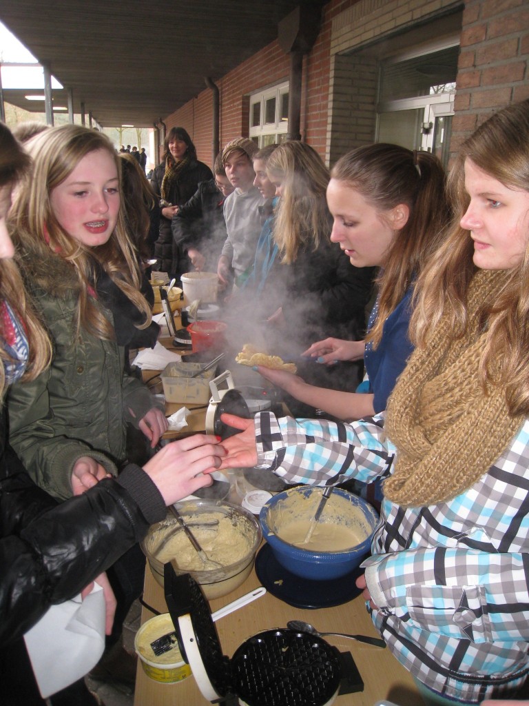 P. Rektor Olav Hamelijnck ließ es sich nicht nehmen, sich persönlich von der Qualität der Waffeln zu überzeugen, die die Klasse 8 c am vorigen Freitag am Rand des Schulhofs verkaufte. Wohl nicht nur, weil der Erlös der gesamten Aktion dem Patenschaftsprojekt Americanopolis zugute kam, war der Andrang in beiden großen Pausen riesig.