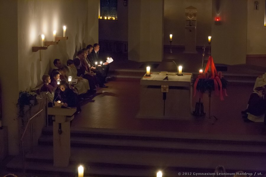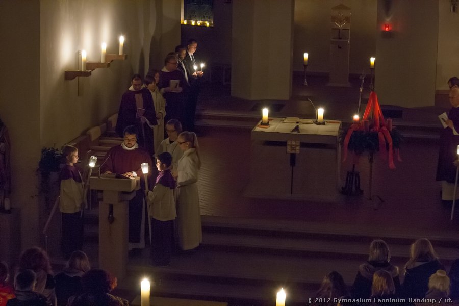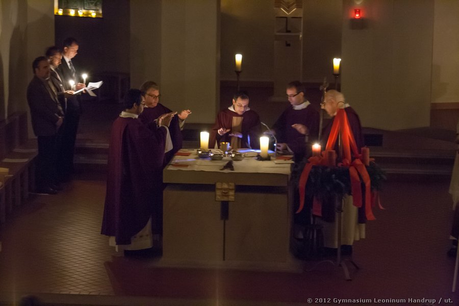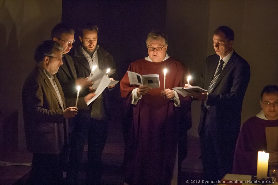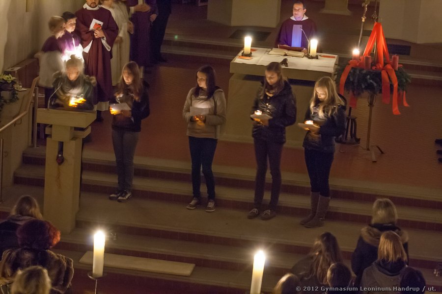 Das Rorateamt am 7. Dezember 2012 war dem Schultag vorangestellt. Zu diesem besonderen Gottesdienst bei Kerzenlicht um 6 Uhr in der Frühe wird traditionell einmal im Advent eingeladen. Inhaltlich mitgestaltet wurde der Gottesdienst von Oberstufenschülern und der Gruppe AufTakt, die “praktische Arbeit” (Sitzgelegenheiten räumen, Kerzen stellen…) übernahmen Unterstufenschüler. Allen herzlichen Dank für ihren Einsatz.