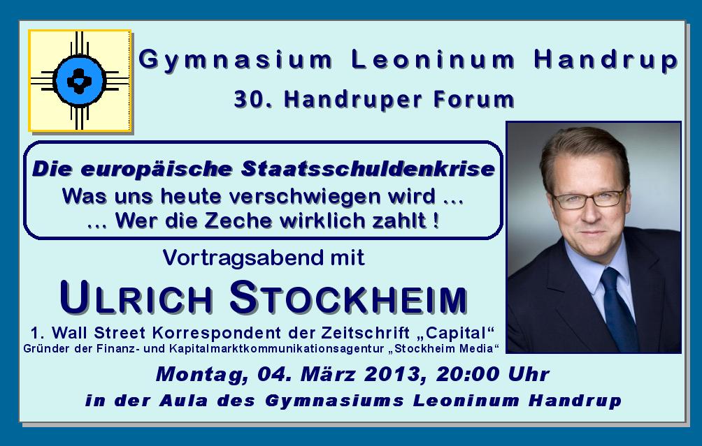 Die europäische Staatsschuldenkrise – Was uns heute verschwiegen wird … – Handruper Forum mit Ulrich Stockheim am 04. März 2013, 20°° Uhr 17. Januar 2013 | Administrator | Kategorien: Aktuelles, Handruper Forum, Vergangene Aktionen Finanzkrise Handrup Handruper Forum Leoninum Schuldenkrise Einladung zum Handruper Forum mit Ulrich Stockheim