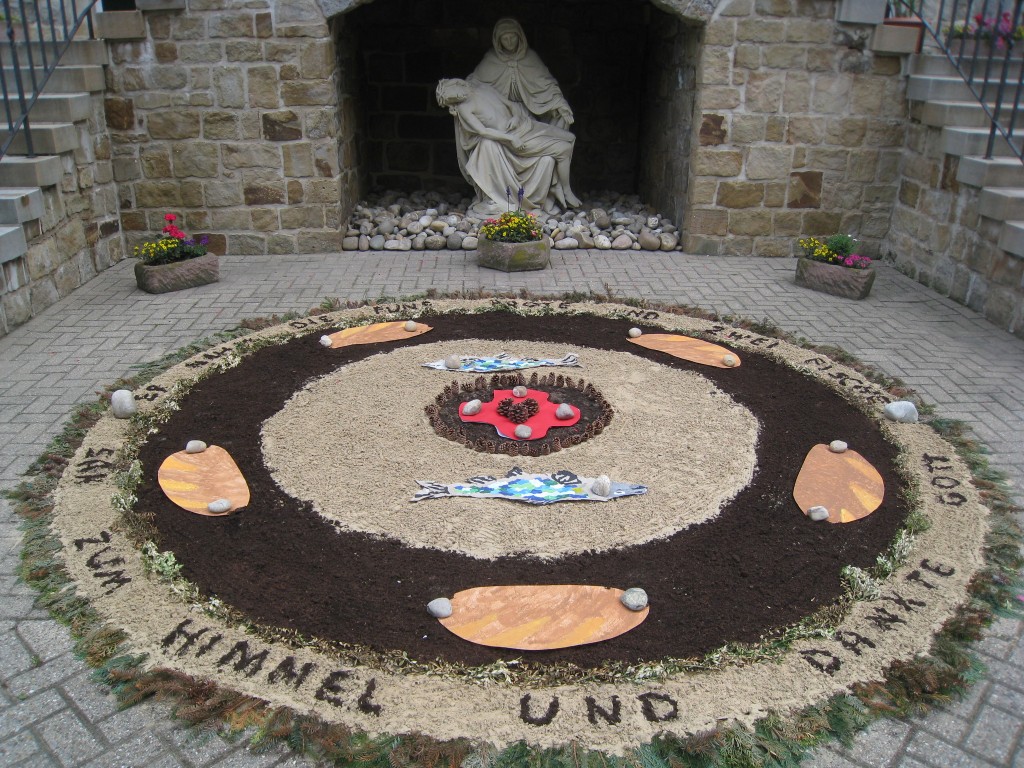 Auch in diesem Jahr gab es wieder einen Bild-Teppich vor dem Haupteingang des Herz-Jesu-Klosters. Das diesjährige Motto steht bei Lukas (9,16) in der Geschichte der Speisung der Fünftausend und das Motiv zeigt die fünf Brote und zwei Fische.