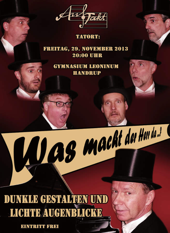 Die Handruper Gruppe „AufTakt“ lädt wieder zu einer musikalisch-literarischen Spurensuche ein, diesmal im wahrsten Sinne, nämlich zu einer kriminalistisch gefärbten. Unter dem Titel „Was macht der Herr da? Dunkle Gestalten und lichte Augenblicke“ wagen sich die Herren in Frack und Zylinder in die Welt der Gauner und Ganoven. Neben dem obligatorischen „Kriminaltango“ und anderen üblichen Verdächtigen geben sie sachdienliche Hinweise zum Unter- und Abgründigen, das sie mit detektivischem Spürsinn auch im scheinbar Harmlosen dingfest machen. Tatort ist das Gymnasium Leoninum Handrup am Freitag, dem 29. November 2013, um 20:00 Uhr in der Aula. Der Eintritt ist frei.