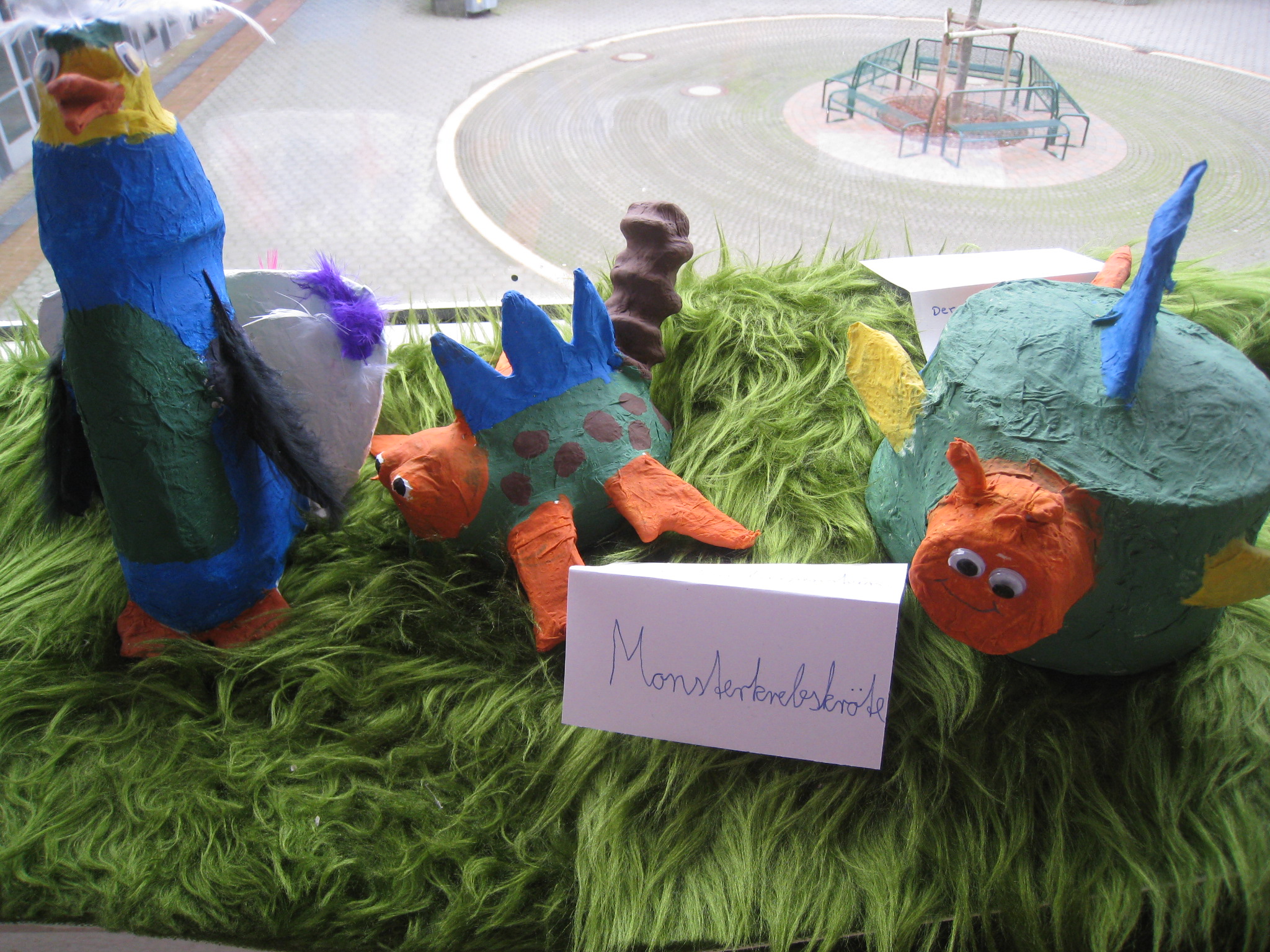 Bunt und kurios geht es zur Zeit im Flur zwischen Kunst- und Erdkunderaum zu: Eine ganze Schar von “exotischen” Tieren ist (auf dem Weg in die Winterquartiere?) in Handrup gelandet.