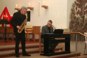 Den Erwartungen des Publikums wurden Burger und von Klewitz wieder einmal gerecht. Ganz im Sinne des Jazz und dabei auf ihre ganz eigene Art und Weise interpretierten sie bekannte weihnachtliche Lieder und Choräle. Mit teilweise atemberaubender Geschwindigkeit ließ Markus seine Hände über die Tasten gleiten, während Jan von Klewitz seinem Saxophon nicht nur ganz leise, sondern auch das gesamte Kirchenschiff füllende Töne entlockte. Im Dialog der beiden Instrumente entstand so eine Verbindung von bekannter Tradition und kreativer Improvisation, in der vertraute Klänge und Tonfolgen immer wieder durchschienen, sich allmählich auflösten und dann wieder herauskristallisierten. Zu den Klassikern wie „Es ist ein Ros entsprungen“, „Amazing Grace“ oder „Maria durch ein Dornwald ging“ gesellten sich sich auch Eigenkompositionen wie das als Reaktion auf den Tod des Vaters von Markus Burger entstandene „Homecoming“. Mit dem schon obligatorischen „Lobe den Herren“ sollte das Konzert schließlich seinen Ausklang nehmen, das tat es allerdings erst, als die letzten Töne der Zugabe verklungen waren.