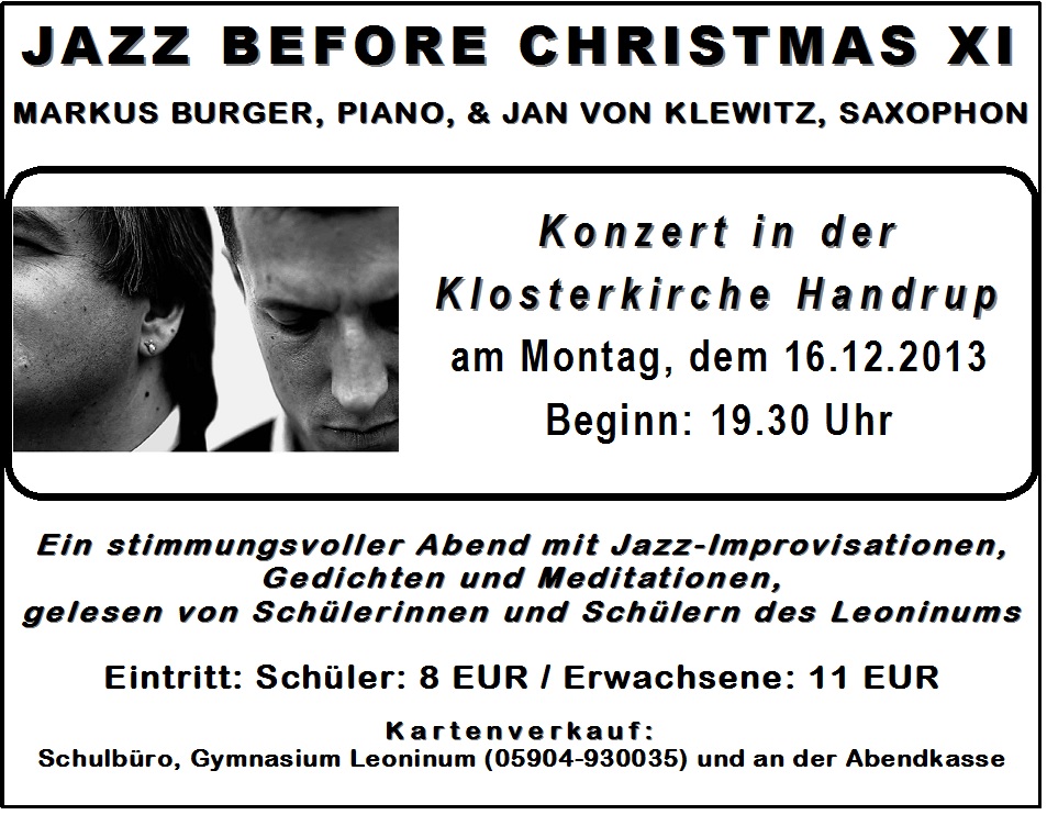 Das traditionelle Adventskonzert “JAZZ BEFORE CHRISTMAS XI” mit Jazz-Improvisationen von Markus Burger und Jan von Klewitz und Gedichten und Meditationen – gelesen von Schülerinnen und Schülern des Leoninums – findet am Montag, dem 16. Dezember 2013, ab 19:30 Uhr in der Klosterkirche in Handrup statt.