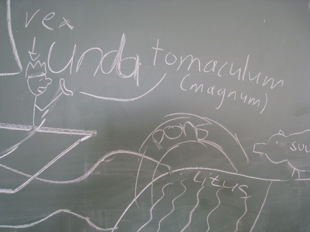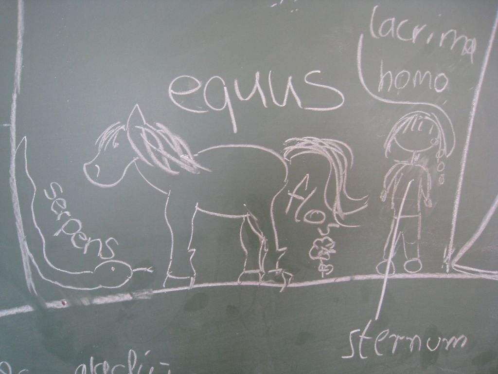 Kaum 15 Minuten dauerte es, bis die Schülerinnen und Schüler der 9 a die Tafel in ihrem Klassenraum in ein Panoptikum aus gezeichneten lateinischen Vokabeln verwandelt hatten. Wirklich alle machten mit! Und beim Blick auf die Details fragt man sich: Ist das noch Latein oder ist das schon Kunst?