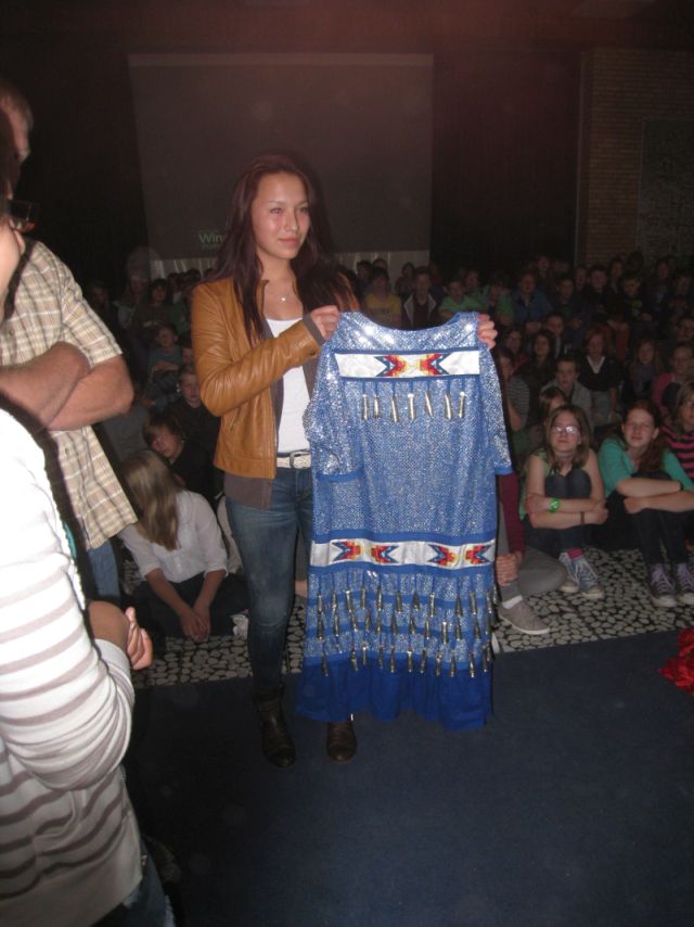 Bunt und international ging es in der Juni-Vollversammlung zu, die wegen des mündlichen Abiturs auf den 28. Mai vorgezogen wurde: Die Gäste von der amerikanischen Partnerschule stellten sich vor und hatten ein traditionelles Pow-wow-Kleid mitgebracht: