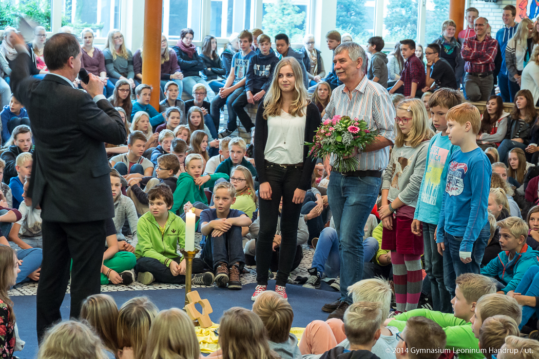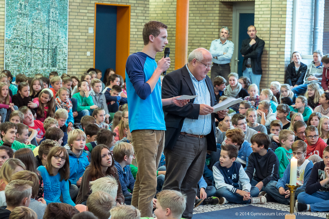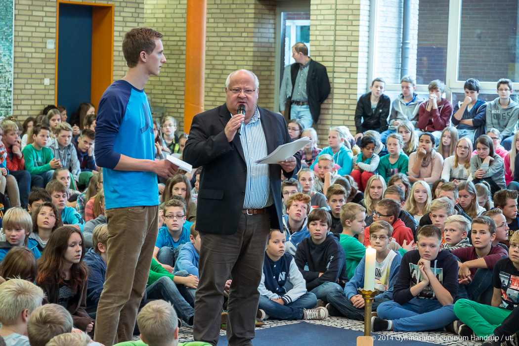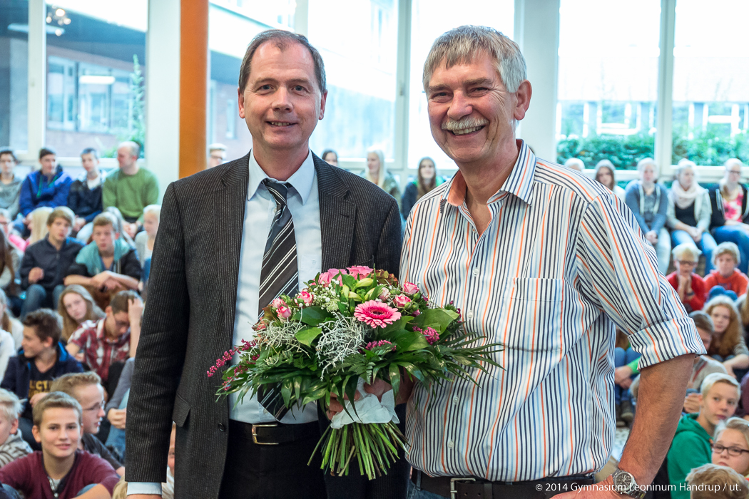 Der Oktober des Schuljahres 2014/15 begann direkt mit einer Vollversammlung. Nach einem Impuls durch P. Ricardo bat Schulleiter Franz-Josef Hanneken den Kollegen Wolfgang Determann in die Mitte,