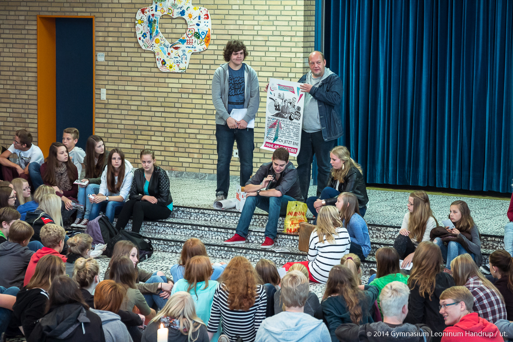 Der stellvertretende Schulleiter Paul Wöste und Schülersprecher Max Hömer stellten kurz die Regularien zur Einführung vor. Die Schulordnung wird an alle Schüler im Laufe des Schultages zusammen mit dem Elternbrief verteilt. Man kann sich dann schon einmal bis zu den Herbstferien in die Schulordnung “reinlesen” (oder sich auch “reingewöhnen”). Sie wird bis zum kommenden Montag (nächster Schultag am Leoninum) auch noch in den Klassenräumen ausgehängt, so dass noch über einzelne Punkte gesprochen werden kann.