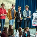 Nach Ende der allgemeinen Vollversammlung baten noch vier Vertreter aus der Gemeinde Fürstenau die Fürstenauer Schüler um Aufmerksamkeit für einige Erläuterungen zur Wahl zum Jugendparlament am 17. Oktober. Claudia, Florian, Matthias und Jonathan besuchen das Leoninum, kommen aus Fürstenau und kandidieren für das JUPA der Samtgemeinde.