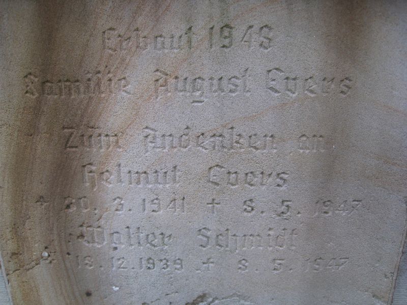 So weit – so bekannt: An der Stelle, wo das Kreuz steht, starben am 8. Mai 1947 zwei Jungen – der sechsjährige Helmut Evers und der siebenjährige Walter Schmidt. Dies verkündet eine Steintafel auf der Rückseite des Kreuzes: