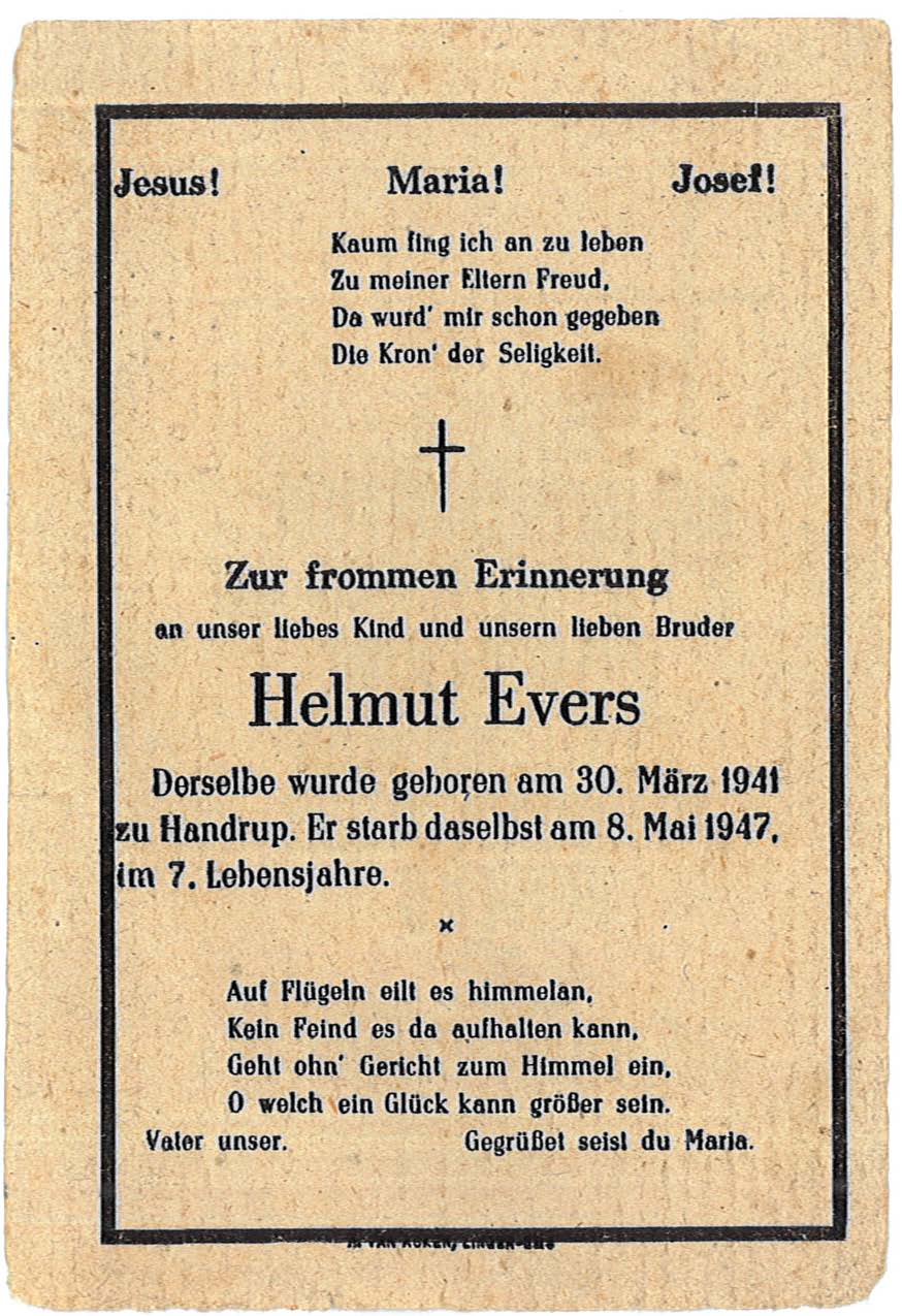 Bereitwillig erzählte er von seiner Kindheit und Jugend in den Jahren nach dem Ende des 2. Weltkriegs. “Das darf man eigentlich gar nicht alles erzählen,” sagte er – allerdings mit einem Augenzwinkern. Waffen und Munition, von deutschen Soldaten auf der Flucht zurückgelassen, lagen am Wegrand und waren ein gefährliches “Spielzeug” für ihn und andere Kinder. So starb sein Bruder wohl durch Hantieren mit alter deutscher Munition. Er selber war zu dem Zeitpunkt bei seinem Onkel in Lengerich gewesen. Und wie sieht es nun mit einem Foto des Verstorbenen aus? Alles in den Wirren am Ende des 2. Weltkriegs mit dem Elternhaus verbrannt. Da das 1. Schuljahr von Helmut Evers gerade erst begonnen hatte, gibt es auch kein Schul-(Klassen-)foto. Immerhin hatte Herr Evers das Totenbildchen seines Bruders dabei.