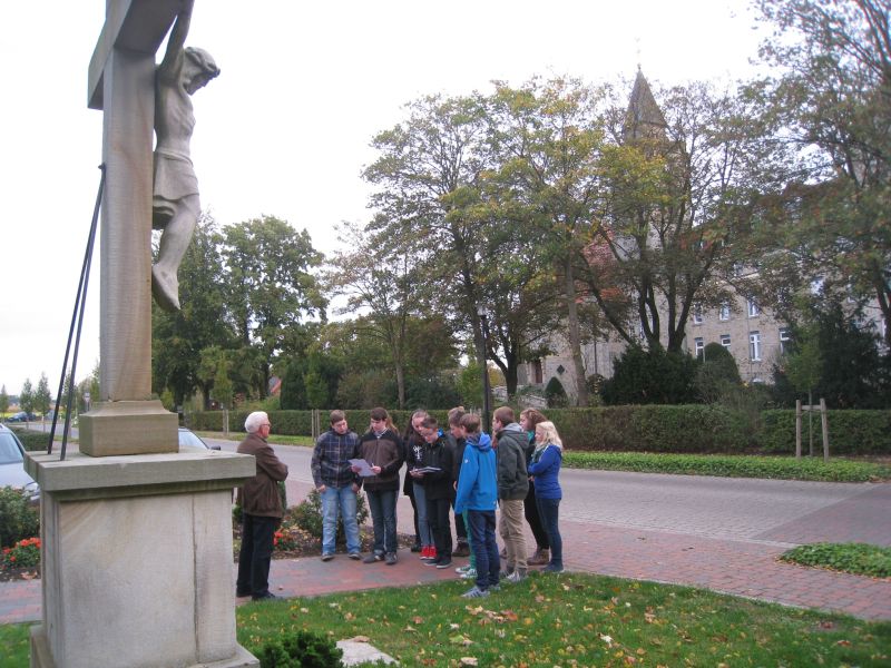 An einem kalten Oktobermorgen traf sich Herr August Evers, Bruder des verstorbenen Helmut Evers, mit den Schülerinnen und Schülern an dem Kreuz, das von seinen Eltern zur Erinnerung an Walter Schmidt und Helmut Evers errichtet wurde.