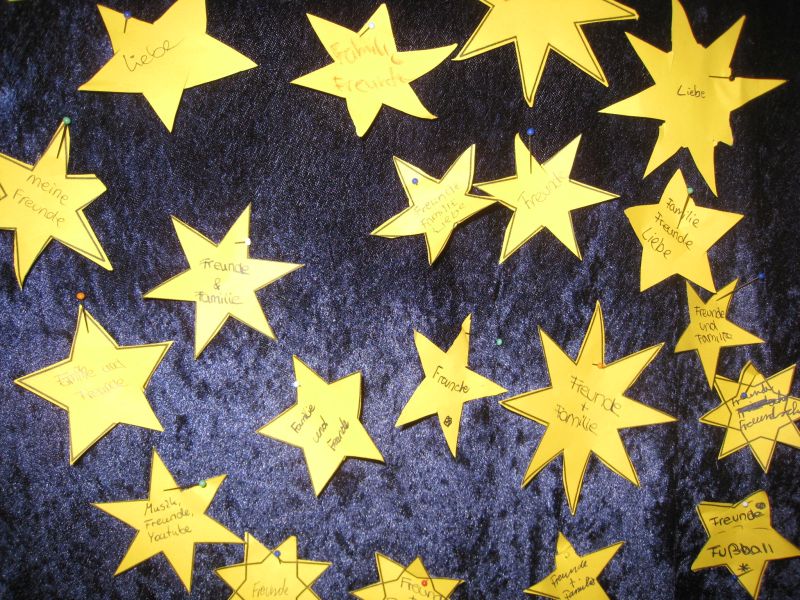 Was gibt Deinem Leben Sinn? Welche Werte hast Du? Zu diesen Fragen kann man u. a. Sterne beschriften und an ein blaues Tuch heften und so wie die Sterne am Himmel geben uns unsere Werte Orientierung im Leben.