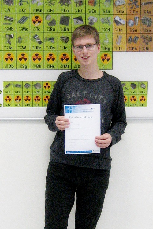 Elias Kuiter (Jahrgang 12) hat erfolgreich an der 1. Auswahlrunde zur Internationalen Chemieolympiade 2015 teilgenommen und eine Urkunde erhalten. Herzlichen Glückwunsch!