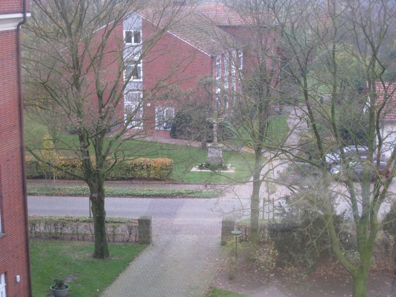 Geschichte ist überall – so z. B. in dem Kreuz vor dem Schwesternheim gegenüber vom Herz-Jesu-Kloster. Alle Handruper kennen dieses Kreuz, vom Sehen, vom Vorbeifahren. Aus vielen Klassenräumen der Schule kann man es sehen. (Foto: Der Blick aus einem Kursraum der vierten Etage)