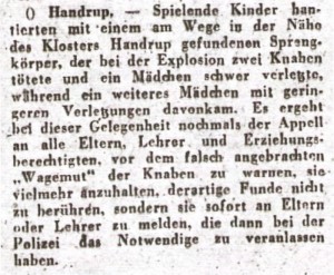 Mittlerweile hatte die Recherche der Schülergruppe bei einem Besuch im Stadtarchiv Lingen auch einen Zeitungsartikel in der Zeitung “Neues Tageblatt” Nr. 38 vom 13. Mai 1947 über das Explosionsunglück in Handrup zu Tage gebracht.