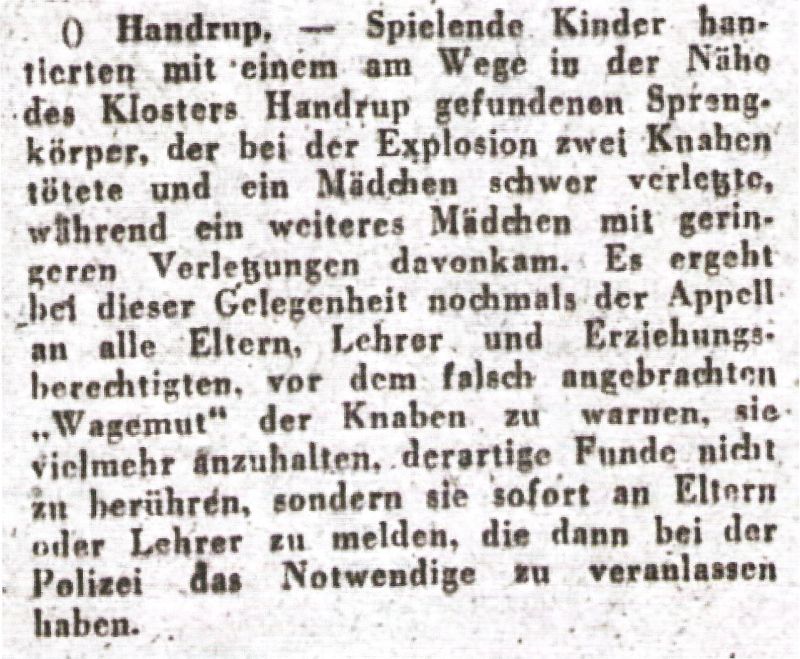 Ohne dass jetzt P. Hogeback, der ehemalige Handruper Pfarrer, als “alt” bezeichnet werden soll – er konnte weiterhelfen! P. Hogeback lud nicht nur einen “Ohrenzeugen”, den ehemaligen Schüler Herrn Hans Barlage, zu einem Gespräch ein, sondern stellte auch einen telefonischen Kontakt mit Frau Carola Tieke, dem bei der Explosion schwer verletzten Mädchen, die jetzt in Düsseldorf lebt, her.