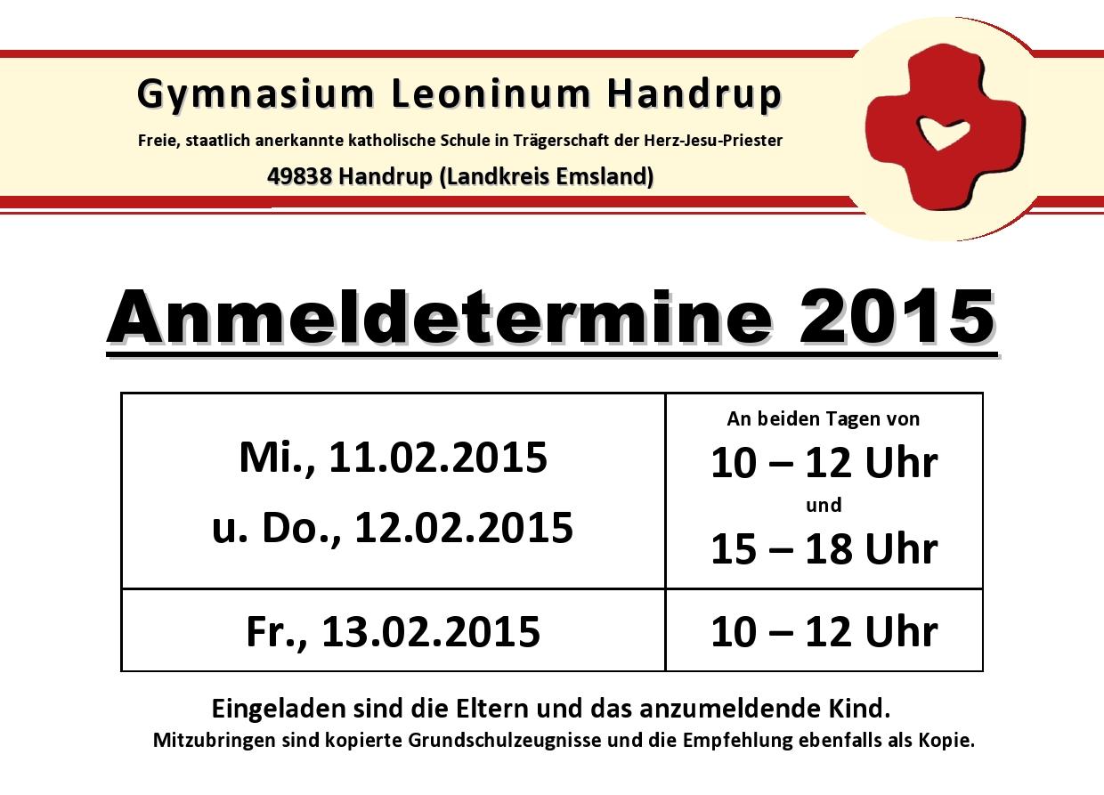 Anmeldung für das Schuljahr 2015 / 2016 18. Januar 2015 | Administrator | Kategorien: Vergangene Aktionen Anmeldetermine Anmeldung Gymnasium Leoninum Handrup Handrup Leoninum
