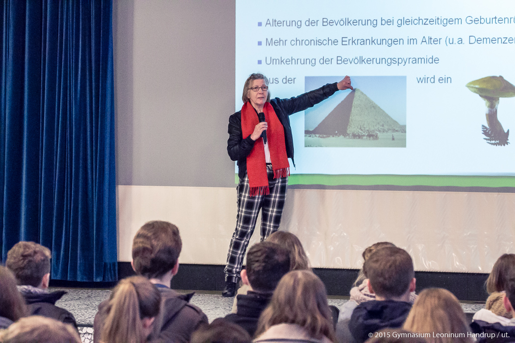 Eine Hinführung zum Sozialpraktikum erfolgte zuvor an zwei Vorbereitungstagen nach den Weihnachtsferien. Am Do., d. 08.01.2015 referierte Fr. Rita Wallmann (Demenz-Servicezentrum Emsland in Meppen) in der Aula vor den ca. 140 Schülern und ihren Religionslehrern zum Thema Demenz, welches aufgrund seiner zunehmenden Bedeutung immer wichtiger wird. Im Anschluss daran wurde auf der Grundlage eines Films dieses Thema in den einzelnen Religionskursen noch vertieft behandelt.