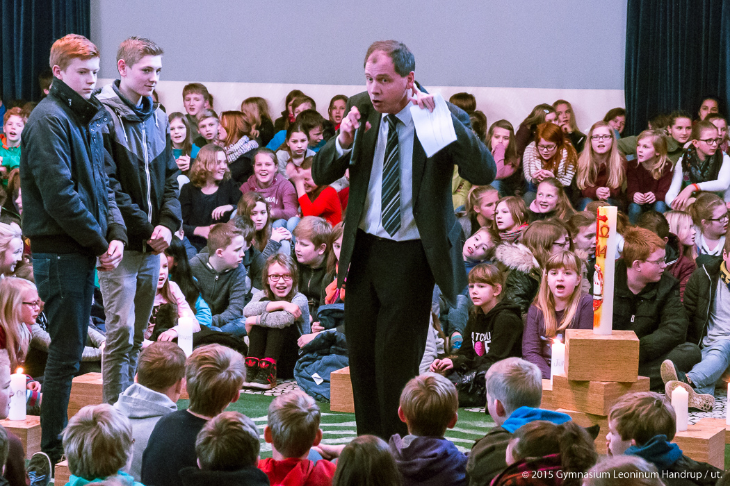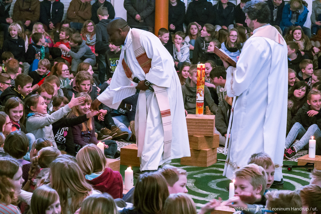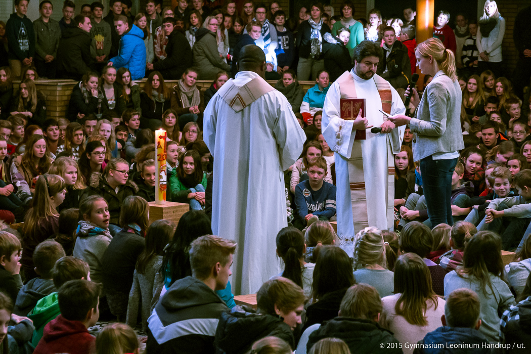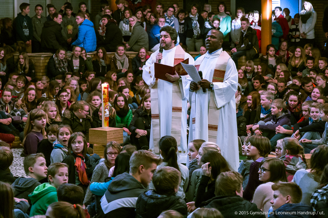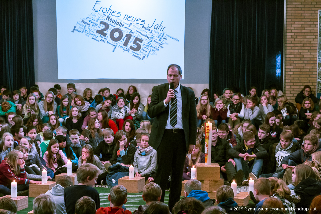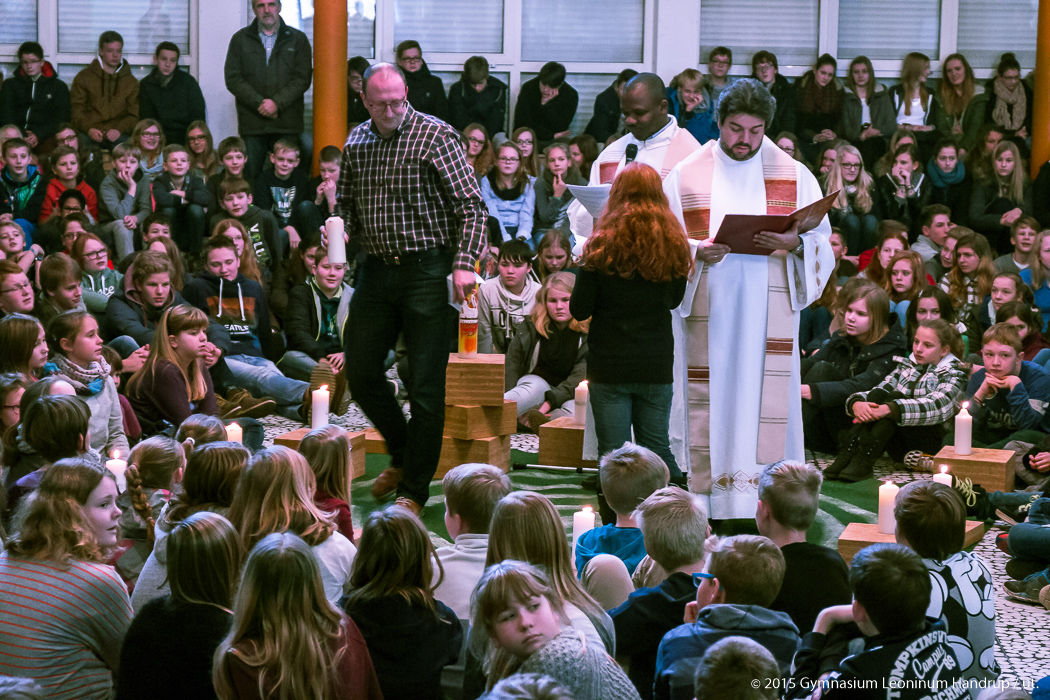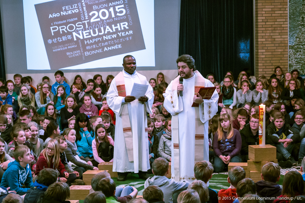 Mit einem Wortgottesdienst begann die Schulgemeinschaft des Leoninum das Jahr 2015. P. Ricardo und P. Emmanuel leiteten den Gottesdienst, der mit Texten, Gebeten und Liedern passend zum Jahresanfang gestaltet war. Zentraler Punkt im Gottesdienst war das Entzünden von 12 Monatskerzen, jede mit einer Fürbitte für einen der Monate des Jahres verbunden.