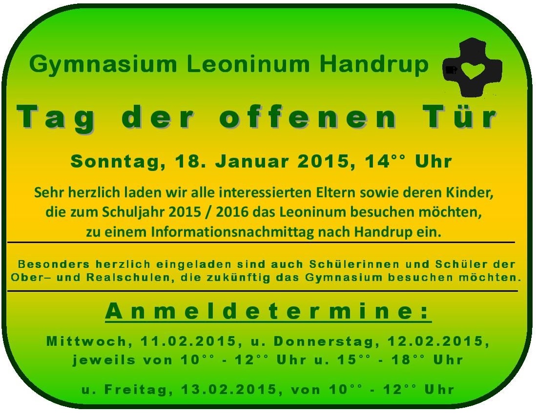 Tag der offenen Tür am 18. Januar 2015 & Anmeldetermine 12. Januar 2015 | Administrator | Kategorien: Vergangene Aktionen Gymnasium Leoninum Handrup Handrup Leoninum Tag der offenen Tür
