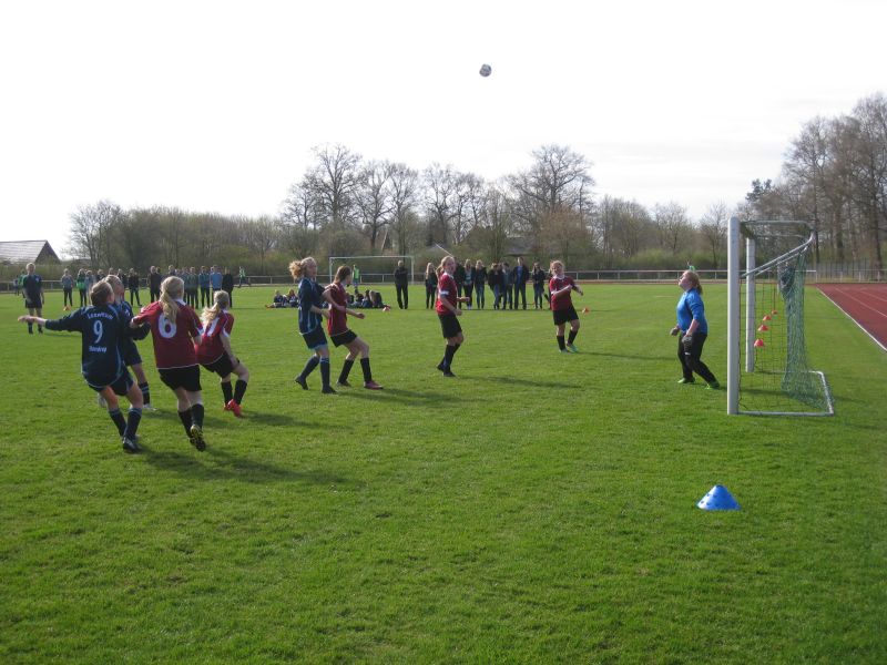 Am vorigen Donnerstag fanden auf dem Handruper Sportplatz im Dehon-Stadion die Spiele der Mädchen aus den Jahrgängen 8 – 10 um die Emsland-Meisterschaft statt. Das von Herrn Deguara betreute Handruper Team ließ sich nicht stoppen und besiegte die Gegnerinnen aus Meppen und Sögel mit 5 : 0 und 4 : 0. Auch bei den nun kommenden Landesmeisterschaften hat die Handruper Mannschaft gute Aussichten. (Das Foto zeigt eine Szene aus dem ersten Spiel gegen Meppen nach einer Ecke der in blau spielenden Handruperinnen.)