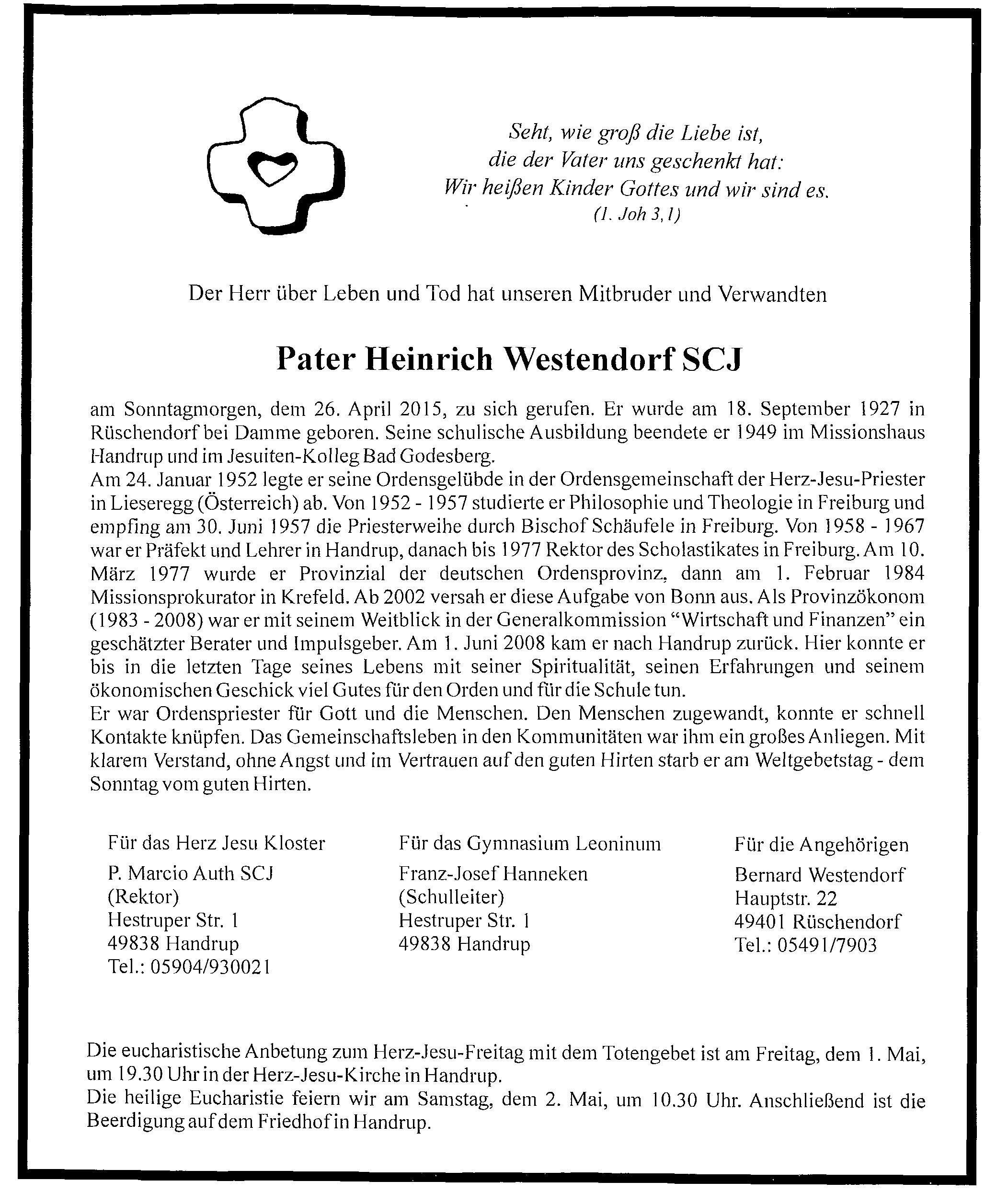 Im Jahre 2008 kehrte Pater Westendorf nach Handrup zurück und übernahm im Ökonomat sofort wieder Verantwortung für die Kloster- und Schulgemeinschaft. Stets zeigte Pater Westendorf ein besonderes Interessen am Schulleben und am Wohlergehen der Schülerinnen und Schüler. Trotz seines hohen Alters nahm er – immer wenn es ihm möglich war – an den Veranstaltungen des Leoninums teil: