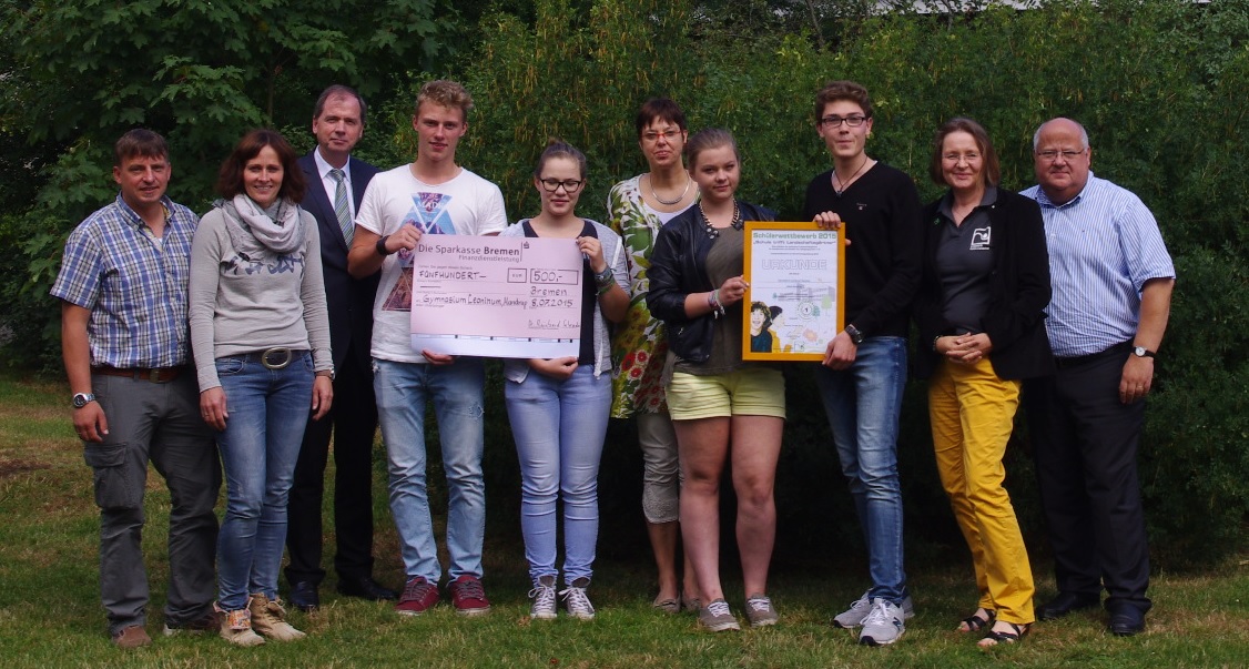 v.lks.: Markus u. Birgit Reisinger, Schulleiter Franz-Josef Hanneken, Justus Kruse, Franziska Thünemann, Betreuende Lehrkraft Angelika Meemann, Jamie Fransen, Marek Haar, Frau Kaminski v. Fachverband Garten-, Landes- und Sportplatzbau Niedersachsen-Bremen, Stellv. Schulleiter Paul Wöste