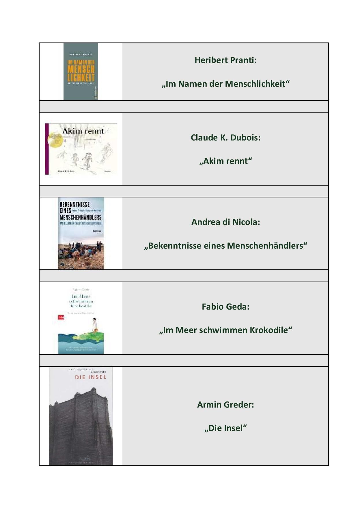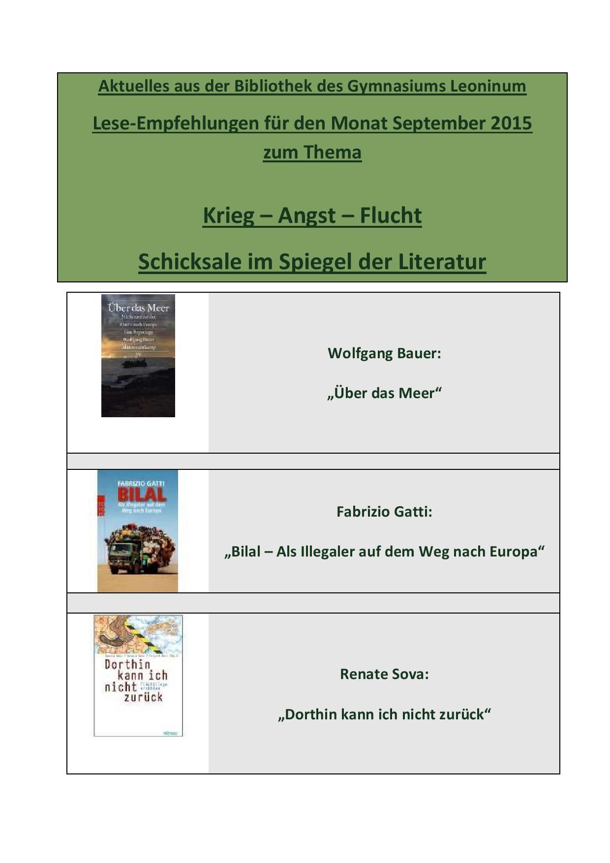 Aktuelles aus der Bibliothek: Lese-Empfehlungen zu den Themen Krieg – Angst – Flucht — Schicksale im Spiegel der Literatur 09. September 2015 | Administrator | Kategorien: Aktuelles, Bibliothek Die Bücher sind ab Montag ausleihbar.