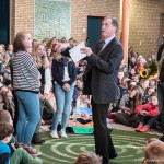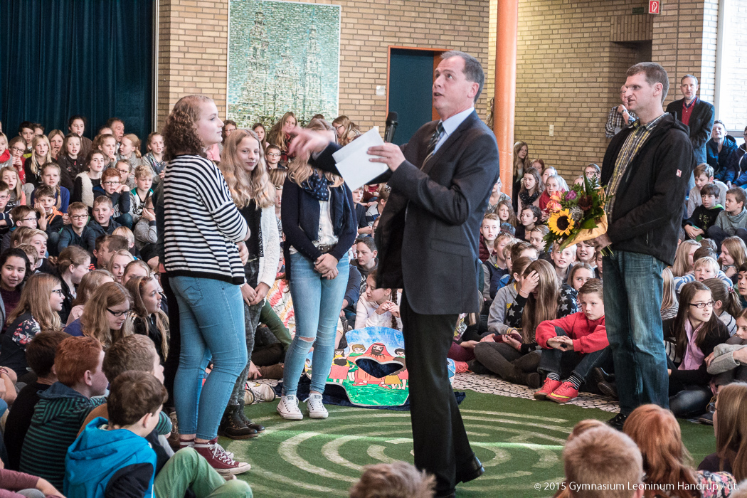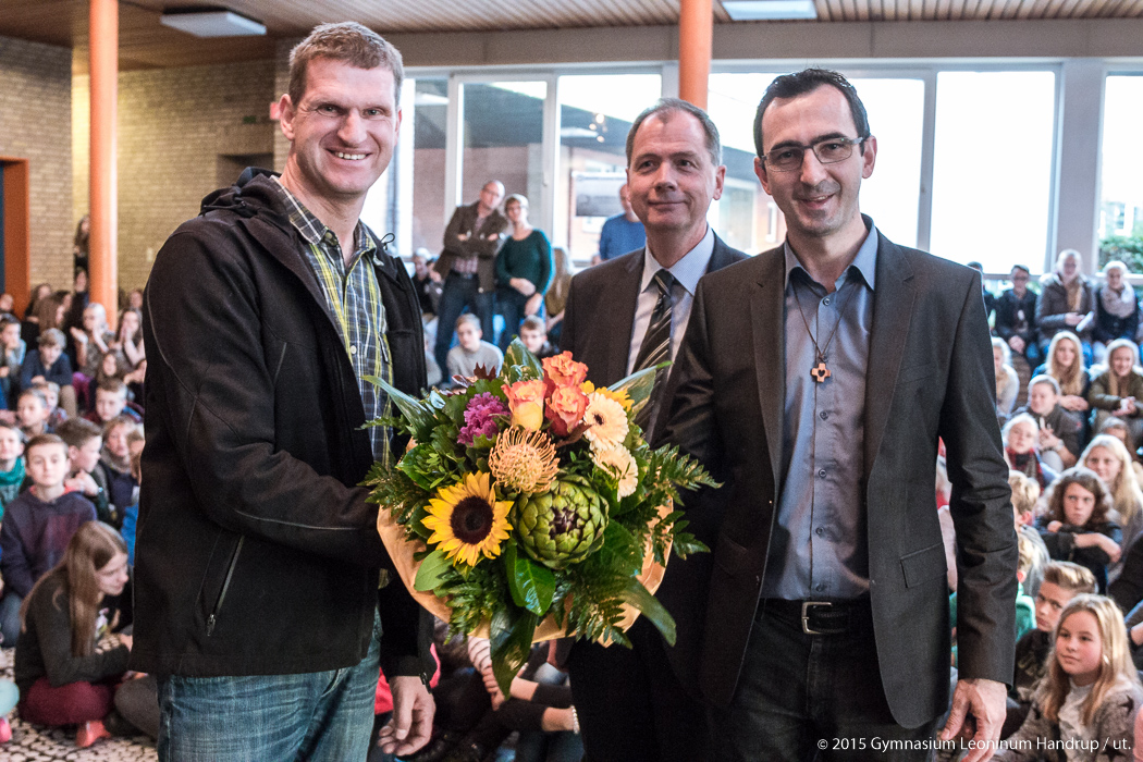 Schulleiter Franz-Josef Hanneken machte aufmerksam auf die in der kommenden Woche stattfindende Marien-Vesper mit “AufTakt” und auf die Aufführungen des “Jägerstätter” durch die Theater-AG. Besonderes Highlight der Vollversammlung waren die Glückwünsche von Rektor P. Marcio an den Hausmeister Peter Janßen, der nun schon 25 Jahre als “Gute Seele” des