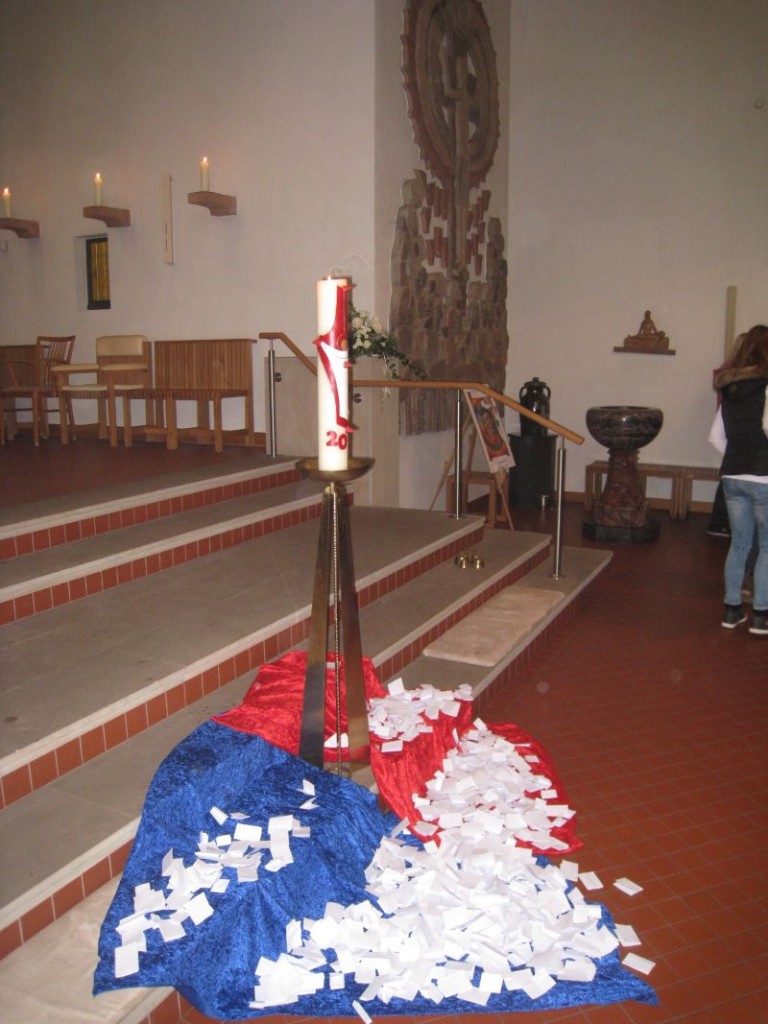 Am Montag, dem ersten Schultag nach den Herbstferien, fanden in der Handruper Klosterkirche Allerseelen-Gottesdienste statt. Bei dieser Gelegenheit konnten die Schülerinnen und Schüler auch die Namen von verstorbenen Angehörigen auf Zettel schreiben, vor der brennenden Osterkerze ablegen und ihrer gedenken.