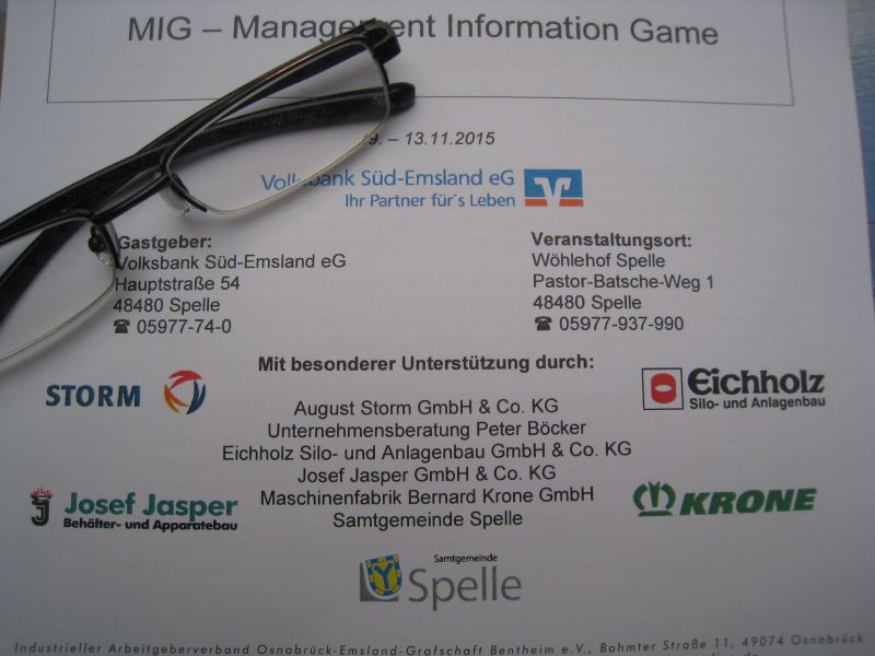 Am heutigen Montag begann unter der Leitung von Herrn Roland Twyrdy vom Bildungswerk der Niedersächsischen Wirtschaft im Speller Wöhlehof für 23 Schülerinnen und Schüler des Leoninums das diesjährige Management Information Game. Nach einem einführenden Referat von Herrn Richard Niermann von der Volksbank Süd-Emsland eG über “Unternehmensziele und Unternehmensorganisation” arbeiteten sich die drei Spielgruppen in die komplizierte Materie von Art und Umfang der Produktion, Forschungsaufwendungen, Investitionen und deren Finanzierung durch Eigen- oder Fremdmittel, Anpassung von Kapazitäten an veränderte Nachfragesituationen, Vertriebsstrukturen, Verkaufspreise, Qualifikation von Beschäftigten sowie die Höhe von Sozialinvestionen ein. “Produziert” werden in diesem Jahr übrigens Brillen – man darf gespannt sein auf die Ergebnisse.