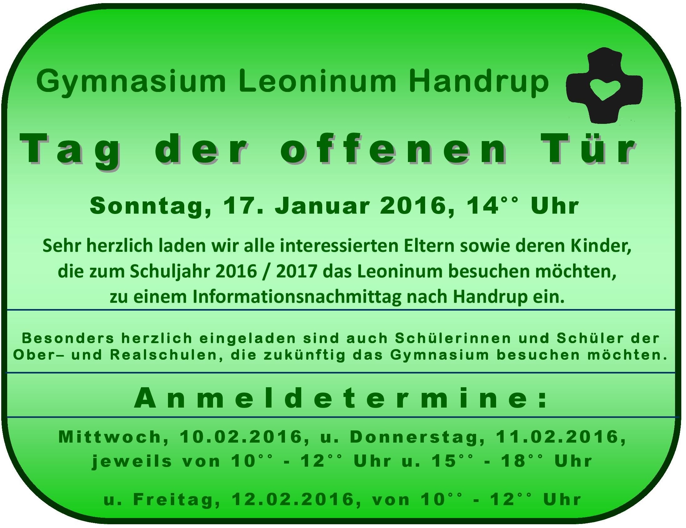 Tag der offenen Tür am 17. Januar 2016 22. Dezember 2015 | Administrator | Kategorien: Vergangene Aktionen Handrup Leoninum Tag der offenen Tür