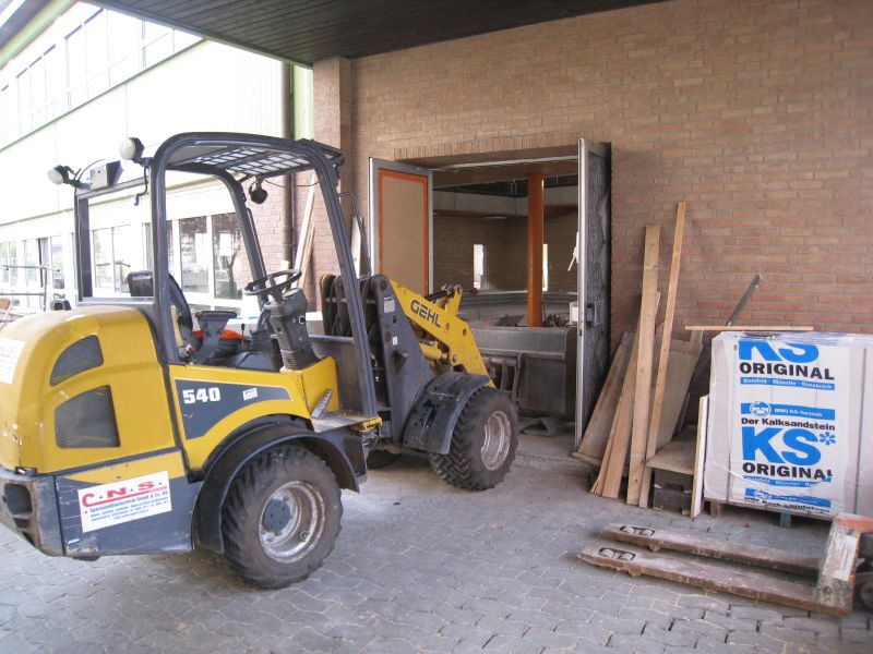 Auch in der Aula des Leoninums gehen die Umbauarbeiten voran. Mit dem Radlader werden Steine aus dem Inneren abtransportiert.