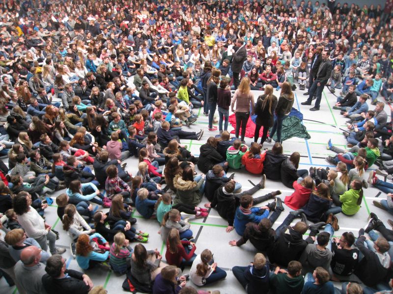 Ein buntes Bild zeigte sich bei der ersten Vollversammlung in der “Nach-Aula-Zeit” von der Tribüne der neuen Sporthalle, in der sich die Schülerinnen und Schüler mit ihren Lehrerinnen und Lehrern versammelten. Es gab viele Informationen, besonders auch zu den Umbau-Maßnahmen im Aula-Bereich. P. Marcio stellte P. Lenin James aus Indien vor, der demnächst die Handruper Klostergemeinschaft verstärken wird.